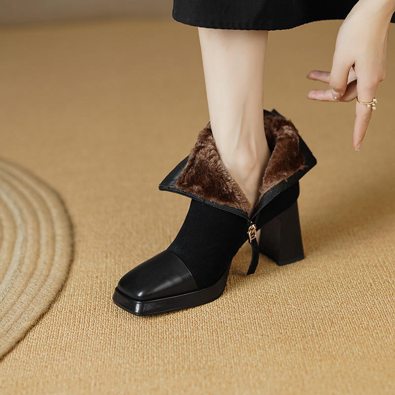 New Round Toe Chunky Heel Leather Boots
